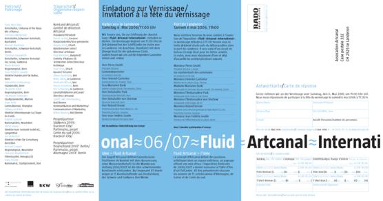 Port du Landeron Samedi 6 mai 2006, 11h00 Nous sommes heureux de vous convier à l’ouverture de l’exposition ≈Fluid≈Artcanal≈International≈. Le vernissage débutera à 11:00 heures sous la tente Artcanal située près du débaracadère dans le port du Landeron. Il sera suivi d’un circuit en bateau Orange Boat pour les hôtes conviés. En outre, nous nous réjouissons d’ores et déjà d’accueillir les oratrices/orateurs suivants Monsieur Pierre Liechti Président Artcanal, Cressier Les représentants des communes du Landeron et de Gals Monsieur Heinrich Gartentor Ministre de la culture suisse, Thoune Madame Marianne Burki responsable du domaine des arts visuels, Pro Helvetia, Zurich Monsieur l’Ambassadeur Park Ambassade de la Corée du Sud, Berne Monsieur l’Ambassadeur von Stechow Ambassade d’Allemagne, Berne Monsieur Roland Streule Président de la direction générale de Rado Watch Co. Ltd., Presenting Sponsor, Lengnau Monsieur Jean-Frédéric Jauslin Directeur de l’Office fédéral de la culture, Berne Avec l’aimable participation d’orangeUn projet intercontinental de coopération artistique 2006/2007 Suisse/Corée du Sud/Allemagne Suisse, canal de la Thielle du 6 mai au 6 août 2006 Corée du sud, DaeJeon City du 27 septembre au 30 novembre 2006 Allemagne, Berlin été 2007