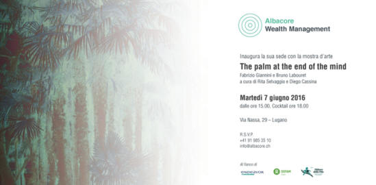The palm at the end of the mind, il primo verso di Of Mere Being - poesia scritta dal poeta americano Wallace Stevens nel 1957- è il titolo della mostra con cui Albacore inaugura la sua nuova sede. Un percorso espositivo che si snoda ambiente dopo ambiente, nel succedersi delle stanze, e presenta gli ultimi risultati della pratica artistica di Fabrizio Giannini e Bruno Labouret. Pianta sacra per gli antichi Egizi, immortale e sempreverde, la palma non teme le tempeste marine, né i venti caldi del deserto. In greco veniva chiamata Phoinix, ossia fenice, il favoloso uccello che si cibava di perle e incenso e rinasceva dalle proprie origini.